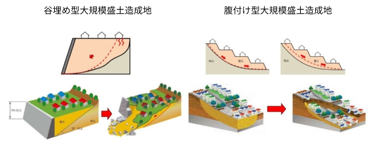 地震の際に盛土全体又は大部分が、主として盛土底面部を滑り面として古い地形に沿って流動、変動又は斜面方向へ移動する可能性があり谷埋め型、腹付け型の2種類で「滑落崩落」の仕方が変わる。